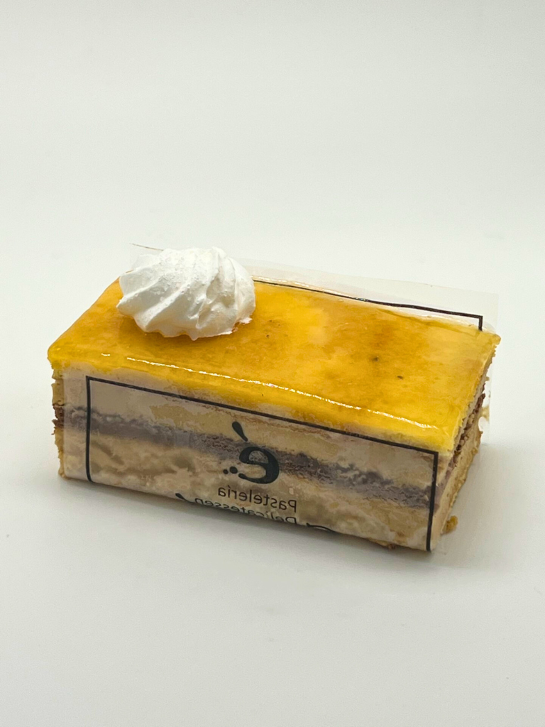 Nuestro pastel de té verde, chocolate y naranja fusiona el sabor intenso del cacao con la suavidad del té y el toque cítrico de la naranja natural.